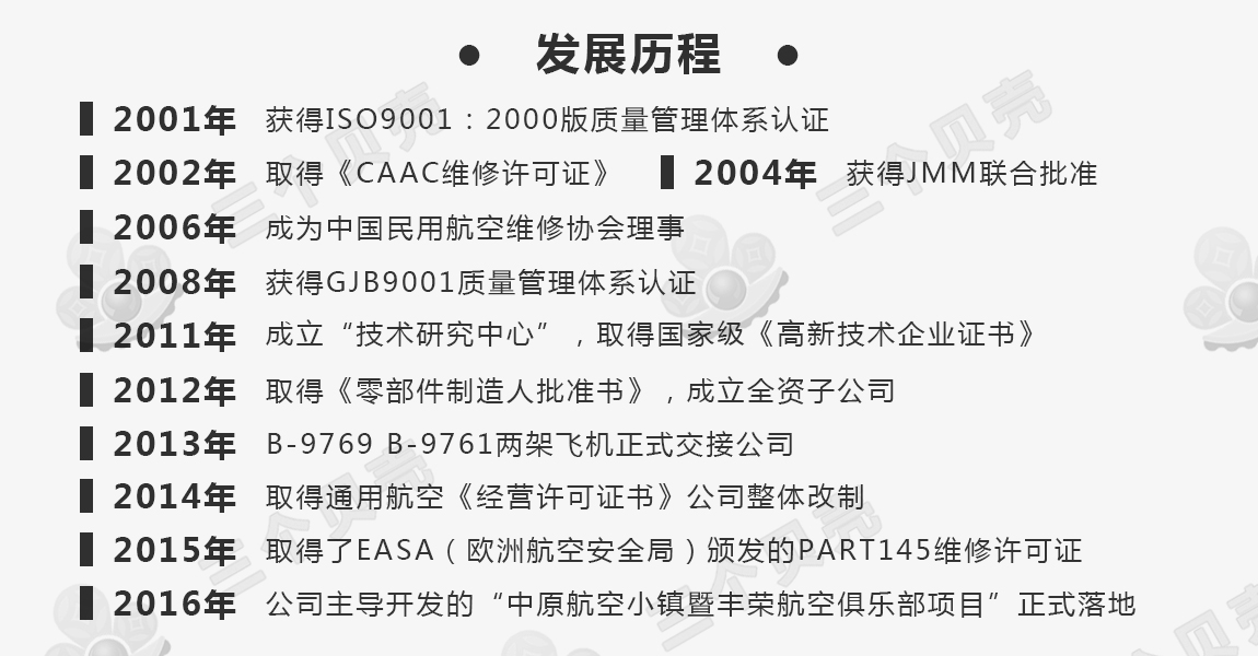 公司获得CAAC批准维修项目1300多项,涵盖ATA21章至ATA80章各类维修项目,机型覆盖目前国内运行的波音系列、空客系列、ERJ等多种机型。